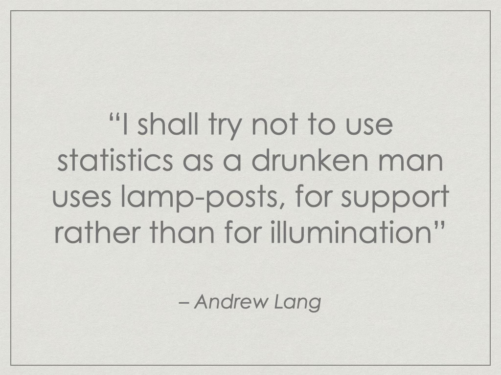 This example highlights the first of three important conversations that are happening around stats. This conversation is between the coach and the stats and there’s a lot going on in it. There are a number of questions being asked in this conversation. The first two questions are “what is this number telling me?” and “what am I telling myself as a result?” These questions come so close together that it can be hard to notice they’re actually separate. The instant between the two questions might be thought of as a “lamp-post moment”, in reference to the Andrew Lang quotation below.